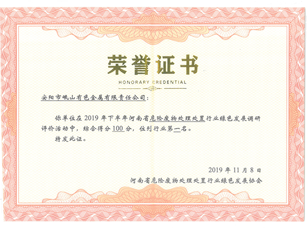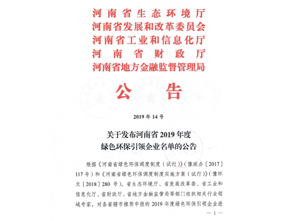 公司獲得“河南省2019年度綠色環(huán)保引領(lǐng)企業(yè)”、“河南省百?gòu)?qiáng)企業(yè)”、“河南省優(yōu)秀民營(yíng)企業(yè)行業(yè)領(lǐng)軍企業(yè)” “河南省工業(yè)節(jié)能減排先進(jìn)單位”、“河南省循環(huán)經(jīng)濟(jì)試點(diǎn)企業(yè)”等